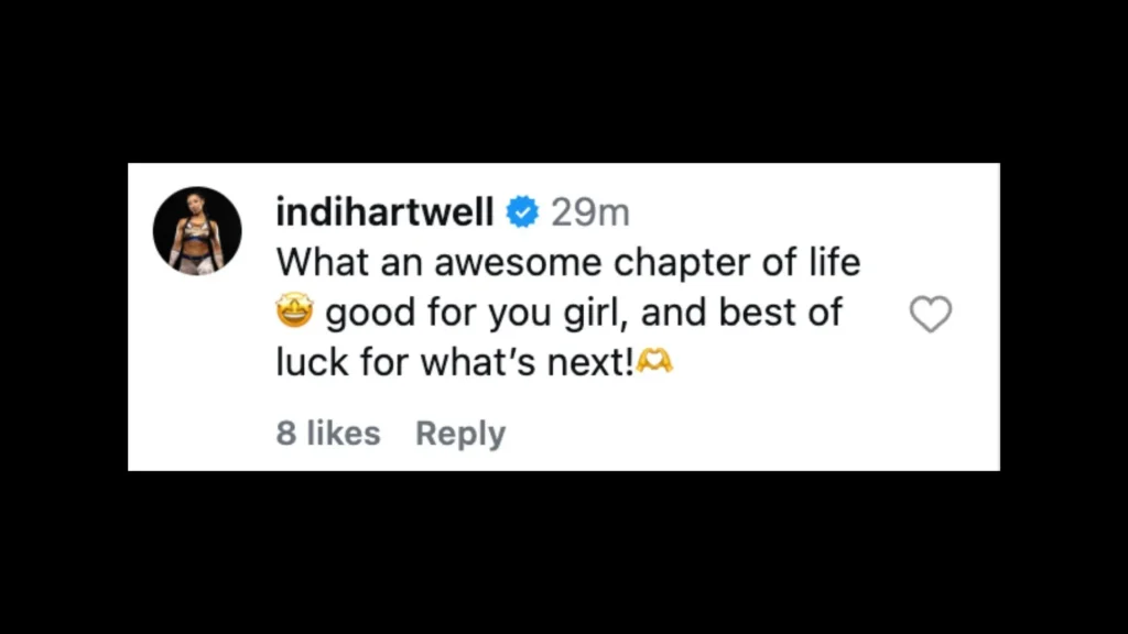 “What an awesome chapter of life 🤩 good for you girl, and best of luck for what’s next!🫶,” wrote Indi Hartwell.